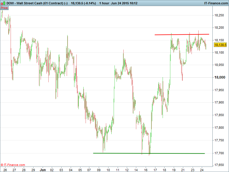 The US Dow Jones has encountered resistance around 18,160 with potential (messy) bearish double top still threatening to sink the index back down towards lows 17,700. 2-week uptrend still in play with a breakout and further upside possible but dependent upon events in Brussels.