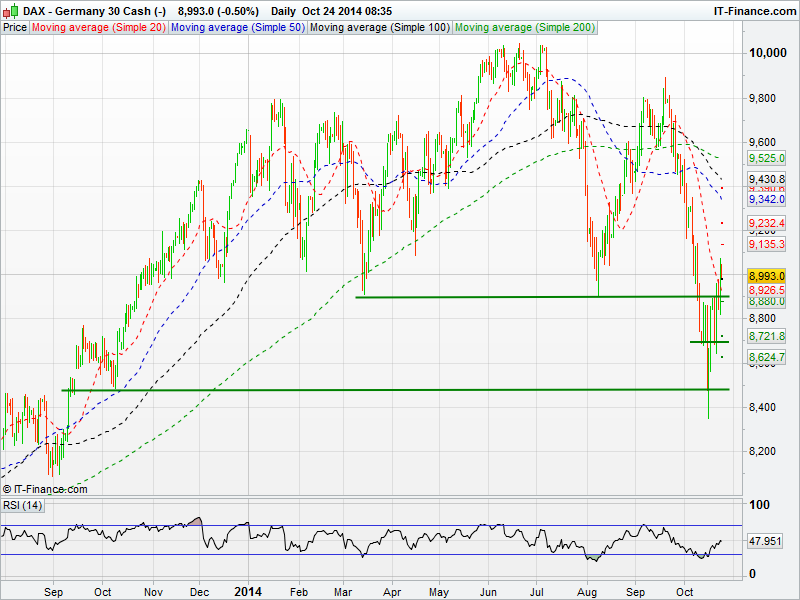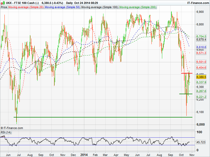 The UK’s UK 100 is still struggling around its 20 day moving average after a few more failed attempts at a break above it yesterday. Sentiment may have been hit today as the first case of Ebola hit New York overnight.