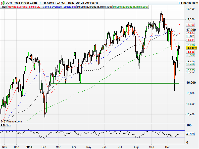 The US Dow Jones found resistance at its 200 day moving average last night after briefly breaking above it before a late pull back on news that the first case of Ebola had hit New York. The 200 day moving average will likely provide resistance again today with support to the downside coming firstly around 16522.