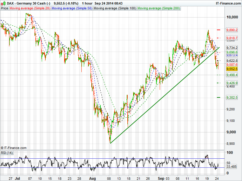 Germany’s DAX has sustained  its break below the 7 week rising trend line with a possible move lower into the 9400’s likely.  The RSI is heading back towards oversold territory and the 50 day MA has now broken below both the 100 and 200 day MA’s.