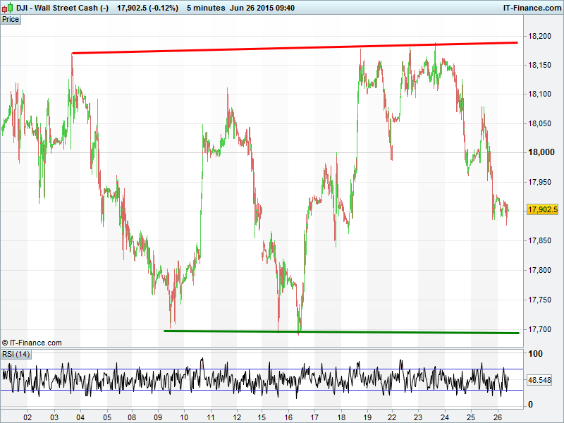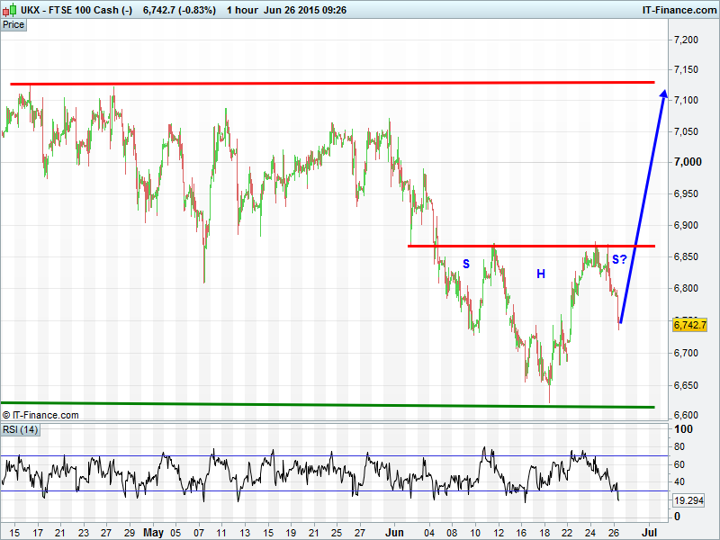 UK Index now below 200-day moving average 6744. DAX back at 11400 support below ceiling of larger down-channel. Dow sitting the middle of 1-month range while Gold continues to languish around $1170, failing to benefit from safehaven demand despite Greece being on the cup of default.