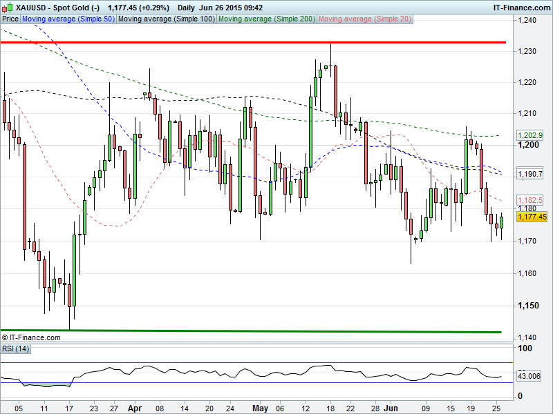 Gold down at recent lows, despite Greek impasse uncertainty and USD strength taking a pause. Failure to get above $1180 for last couple of days keeps alive downtrend from 200-day moving average $1204.