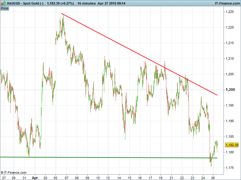 Gold is residing in the $1180s with key support indeed appearing to hold around $1180 itself. Prospect for a good bounce, however, remains muted with all the usual macro drivers apparently failing to have the desired or indeed ‘normal’ effect on the commodity. Moves now pretty much down to technicals with a worrying March-April bearish triangle pattern in formation on the 15-minute chart.