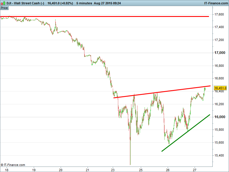 US Dow Jones futures testing resistance 16500, a little calmer following yesterday’s multi-year record gains.