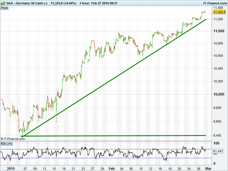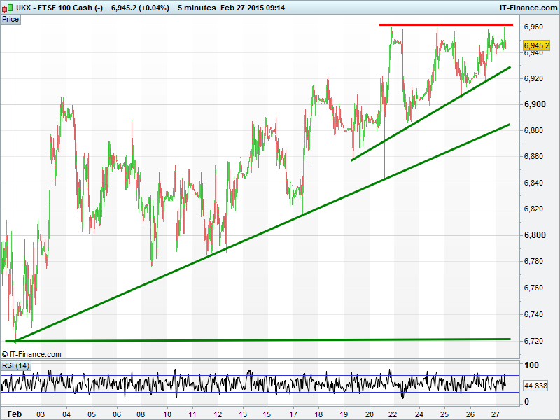 UK Index ‘s February uptrend has lost some steam this week following yesterdays third test of all-time highs. We note potential formation of a bullish ascending triangle pattern that could fuel a (decisive?) break to the upside.