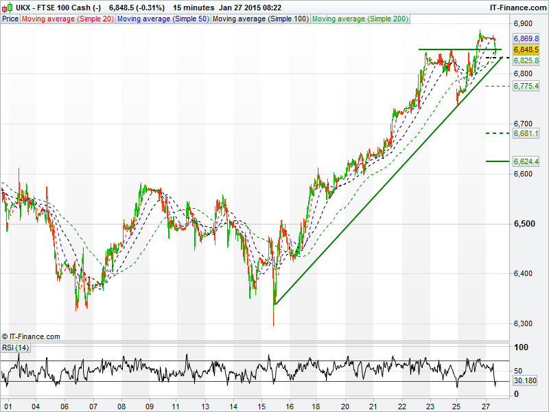 The UK’s UK 100 ‘shas pulled back below 6850 this morning with support likely around the 200 day moving average at 6825. The 50 day moving average has broken above the 200 day moving average whilst the RSI has fallen into oversold territory.