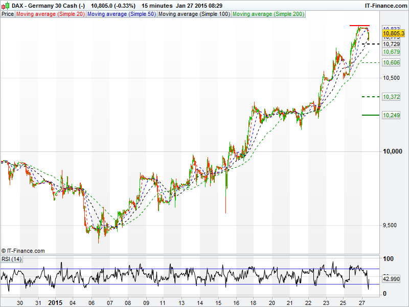 Germany’s DAX registered yet another all-time high yesterday breaking 10800 for the first time. This morning it broke back below 10800 finding support at the 50 day moving average. The RSI is has begun to rise once again after breaking from oversold territory.