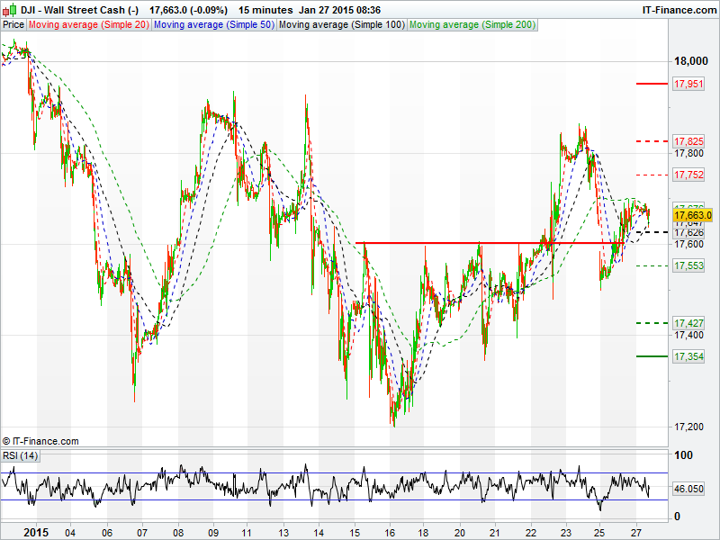 US Dow Jones could trading within its moving averages today with resistance coming into play at the 200 day moving average around 17676 and support coming at the 100 day moving average around 17647.