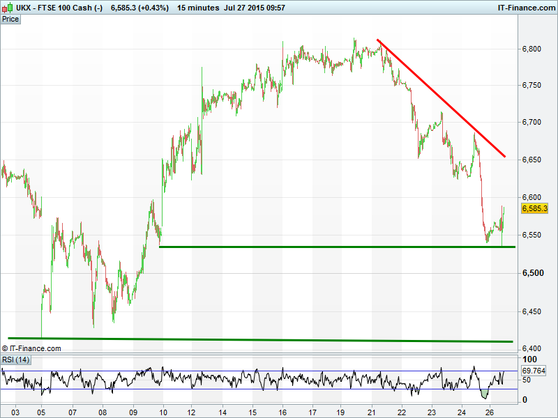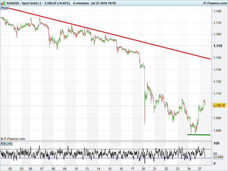 Equities mixed this morning with UK 100 finding support around 6540, the Dow Jones around 17550 but DAX30 continuing last week’s sell-off to trade 100pts lower. Gold bounced back >$1100. This follows a risk-off week due to mixed US/European corporate results, global growth and monetary policy uncertainty and no let-up in commodity price weakness.