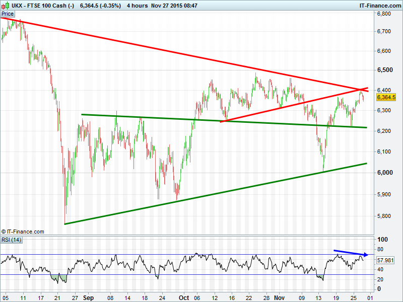 US Dow Jones futures are back from 17900 resistance and now below back-up support at 2-week rising lows 17800. Note also 4-hourly RSI diverging with index value since 19 Nov and now in bearish territory – with that break below 17800 potentially confirming a move in the direction of late August rising support.