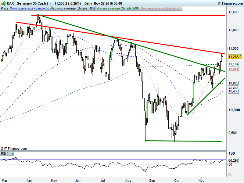 Germany’s DAX now dug in above its 200-day MA but back from a test of long-term resistance 11375. Daily RSI hasn’t gone overbought following a very brief flirt in late Oct and while support looks strong, it’s been failing to match the index’s higher highs with its own since then.