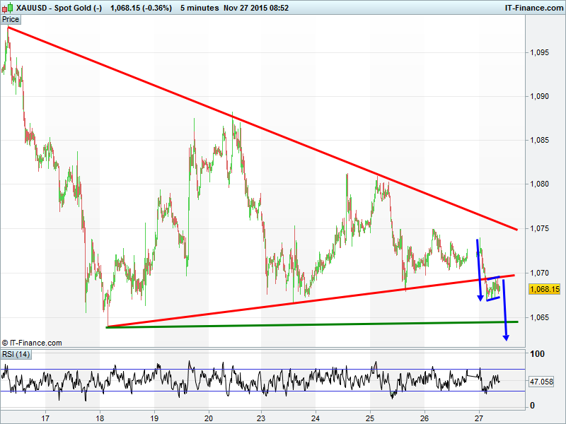 Gold’s looking heavy this morning. Support is holding around recent lows $1067, but look out for a break below and second leg of a bearish flag pattern potentially taking the yellow metal towards $1064.