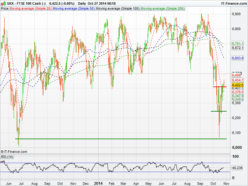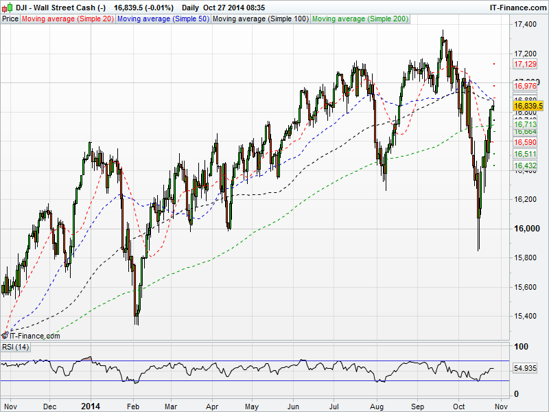The US Dow Jones continues its run back up towards 17000, rising around 1000 points for last weeks lows. Resistance has been found at the 100 day moving average, after the Dow broke above it’s 20 and 200 day moving averages.
