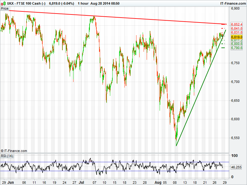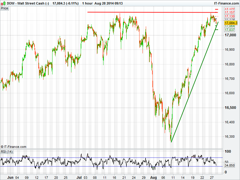 The US Dow Jones has stuttered a bit since hitting a new all-time high. The 3 week rising trend line, which is still in tact, is coming into play as the DOW approaches this level (17064) we look to see if it will hold out as support. A break below this could signal a move back below 17000. A raft of data from the US this afternoon could play its part in determining the direction of these markets today.