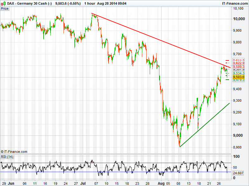 Germany’s DAX found resistance at the 2 month falling trend line yesterday just above 9600. This morning has seen the DAX break two prior support levels with another at 9479 raising concerns that this fall could be more than just a pull back. However, the 3 week rising trend line is still in tact. A plethora of macro data could be the driver for any directional moves in the markets today.