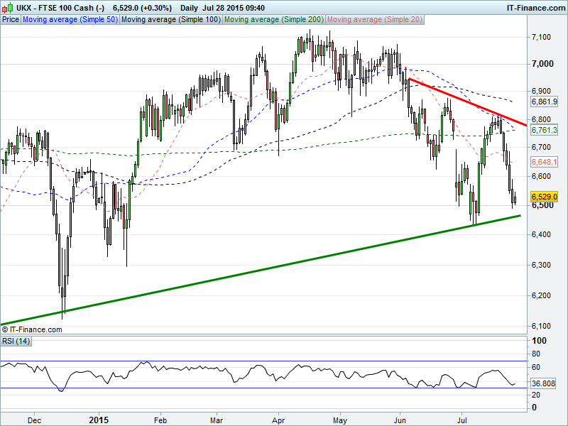 UK 100 found support at 6500 overnight, just above 9-month rising lows 6475, but work to do before breaking trend of falling highs at 6600 and generating confidence in a reversal.