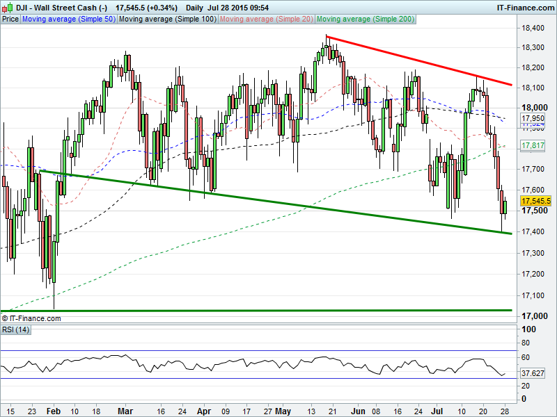 US Dow Jones found support at 17400 floor of Feb-Jul shallow falling channel. Bounce through 17,500 could be start of recovery towards July highs. 200-day MA could be a hurdle at 17800.
