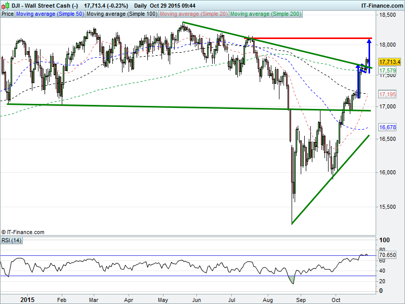 US Dow Jones futures holding its breakout above 17650 and 200-day MA, meaning potential for bullish flag to complete at 18100. Note RSI turning over at overbought.