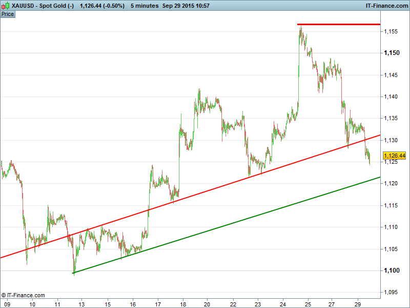 Gold dropped below support at Sept rising lows and into a narrow channel that could still help the yellow metal maintain a choppy uptrend into October. A bounce off the channel floor would be supportive of this while a break below $1120 puts more downside on the cards with an initial $1115 target.