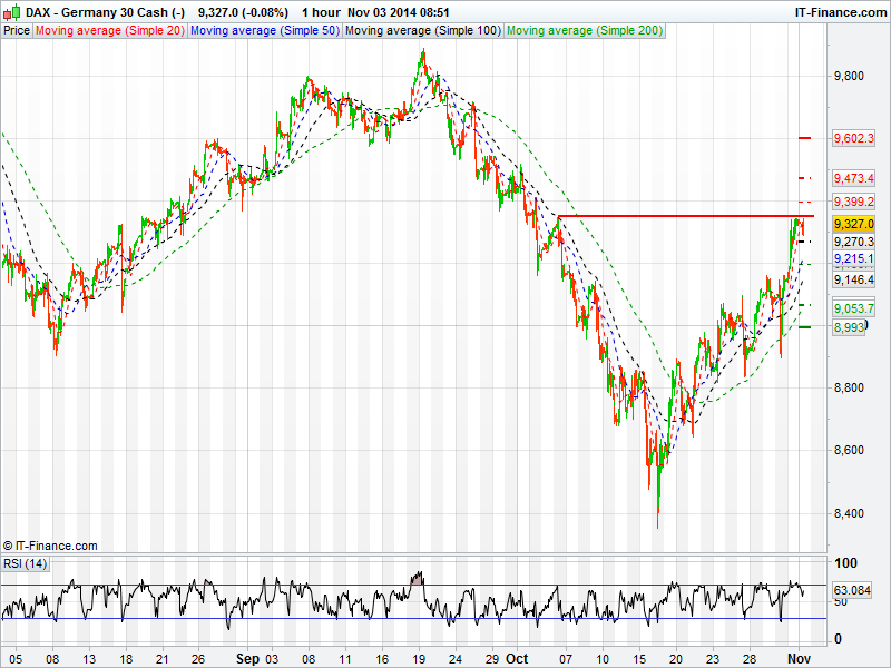 Germany’s DAX continues its 2 week uptrend from 14-month lows, although potential resistance is very close, at 9352. A break of this resistance could yield a run back up to 9500. The DAX is trading above all of its major moving averages, with support possible at the 50, 100 and 200 day moving averages.