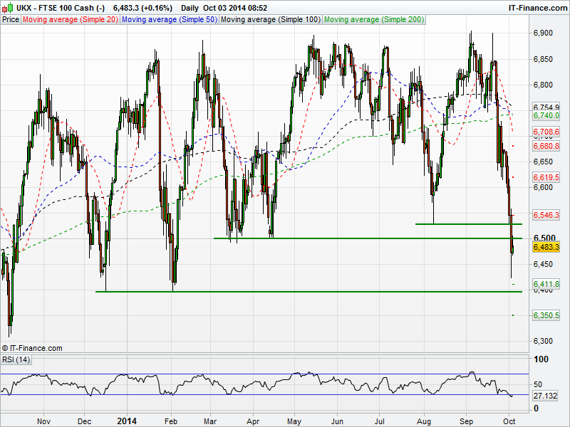 The UK’s UK 100 broke below two key support levels yesterday to trade near 2014 lows. Next level of support should come around 2014 lows of 6396 before a possible retreat to 6300. Prior support may now turn resistance with the first key level to test being 6500. The 20 day moving average has broken below the 50, 100 and 200 day moving averages, whilst the RSI is still in oversold territory.