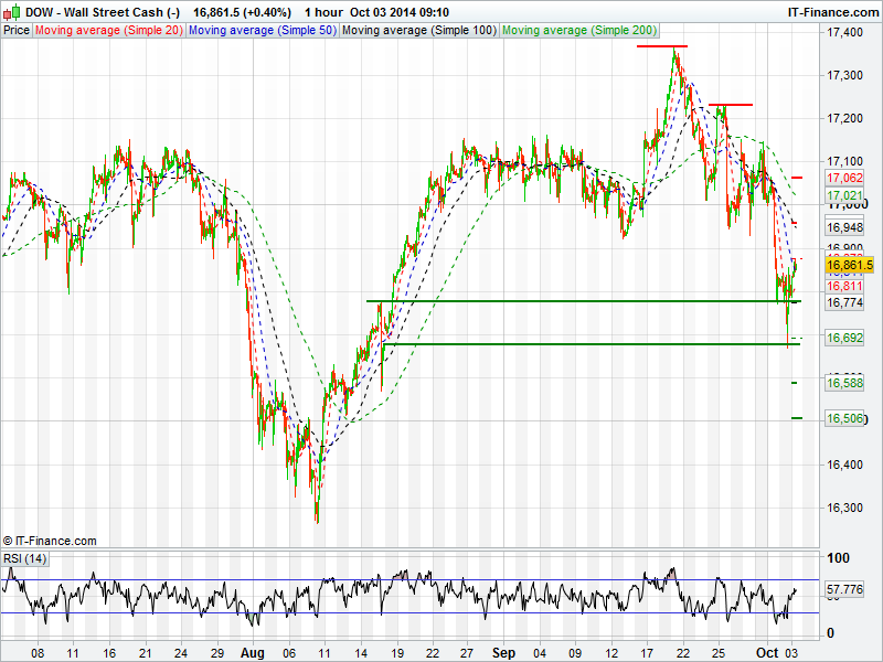 The US Dow Jones broke below a key support level yesterday only to break back above later in session. Futures are pointing to a higher open, however, traders will be cautious ahead of today’s Non-farm payrolls. Support is still there at 16774 and again at 16678. Resistance may be found at 16876, 16948 and then around 17000.