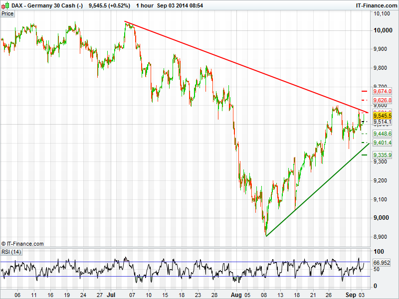 Germany’s DAX continues to tread water and tick up slowly. The 1 month rising trend line is still holding firm, however, the longer term falling trend line from early July continues to prove a level of resistance with a break above giving rise to a push towards 9700. Although a weak set of PMI numbers this morning will do little to aid the upward move.