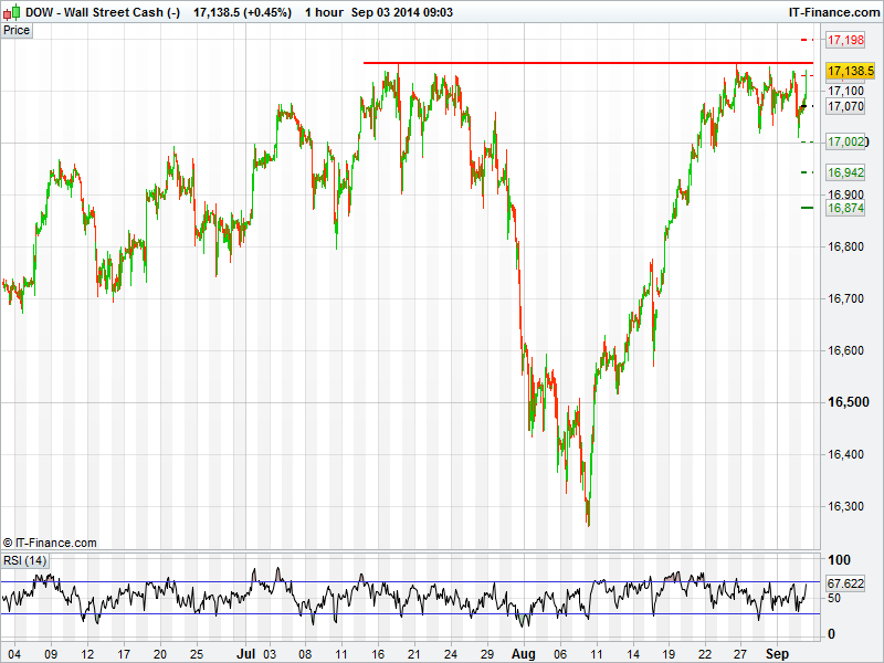 The US Dow Jones has found the resistance towards the all-time highs set last week difficult to break, although news from Russia and Ukraine this morning that there has been an agreement between the two parties on a permanent ceasefire has given the Dow a lift in early futures trading, which could see another all-time high set today.