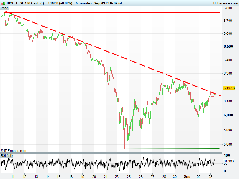 UK 100  broken above Aug falling highs. Next hurdle is late August highs 6260 above which a full reversal and retracement towards mid-Aug highs is possible. Watch for 6200 proving tough to better.