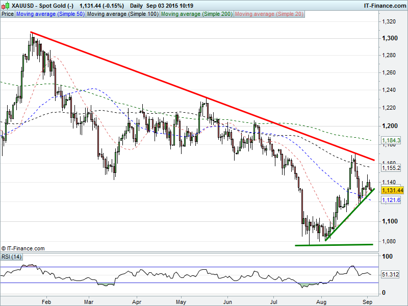 Gold hindered by strong USD derived from 1) fears of a September Fed rate rise and 2) hopes that ECB President Draghi will usher the single currency EUR lower at today’s policy update (QE for longer) due to inflation expectations being held back by growth uncertainty and depressed commodity prices.