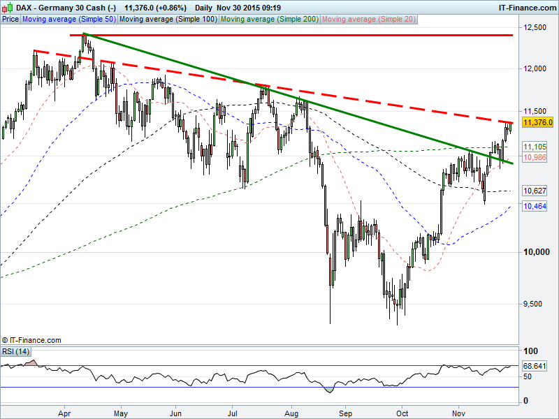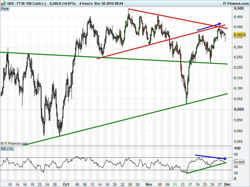 UK 100 fallen back from October falling highs. Of note is the negative divergence of the RSI with the price which would signal bigger reversal after the revisit of 6400.