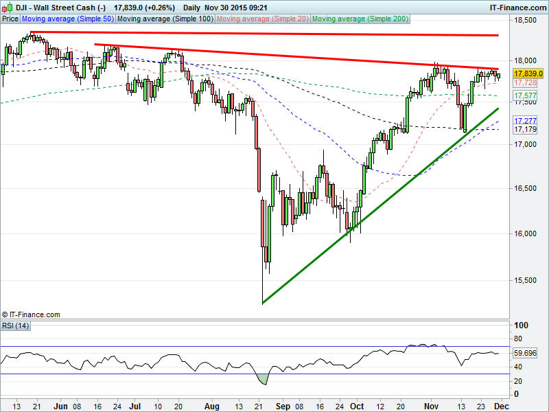 UK Index recovered sharply from early sell-off but remains hindered by 6375 falling highs resistance. DAX testing 9-month intersecting resistance at 11375. Wall St turning over after resistance at 6-month shallow falling highs 17900. Gold creeping ever closer to Feb 2010 lows $1044.