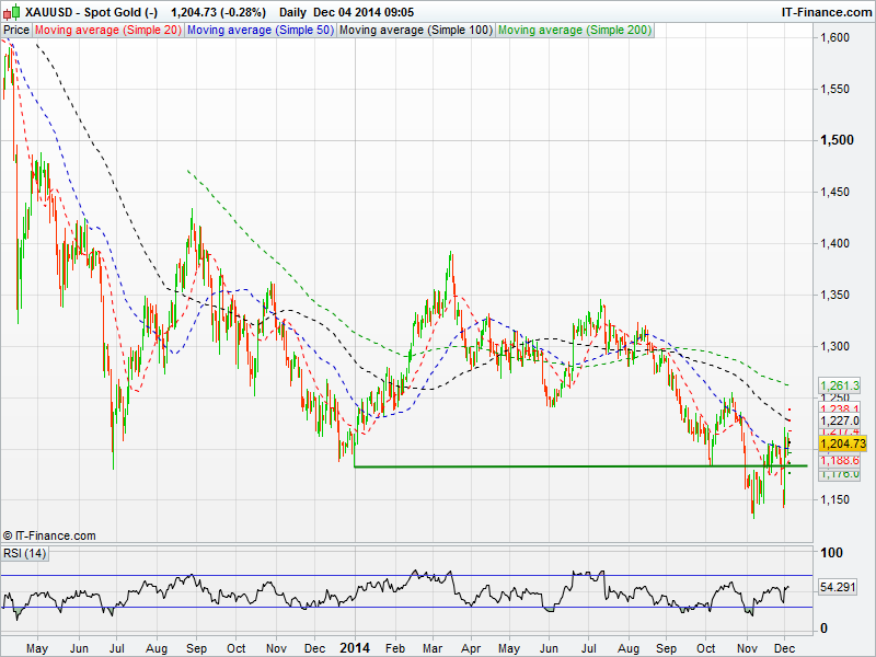 Spot Gold is continuing to trade off its lows of last week with a break above its 50 day moving average. The next resistance level could come at the 100 day moving average around 1227, whilst the 50 day moving average may now provide support around 1200.
