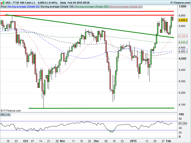 The UK Index has made it back to test 2014 highs of 6905, having rebounded from support at around 6720. The bulls are eyeing all time highs of 6950, hoping that late Jan activity was the flag within a bullish flag pattern and a breakout on the cards. For the moment though, we remain in a 6-month sideways channel 6070-6950.