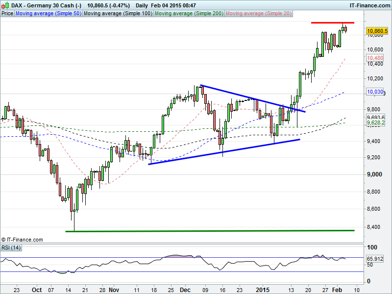 Germany’s DAX has fallen back from yesterday’s fresh all time highs of 10987, but the 2015 rising support remains intact, as does the 3.5 month uptrend and breakout from a Nov-Jan pennant pattern. Note daily RSI falling back from overbought.