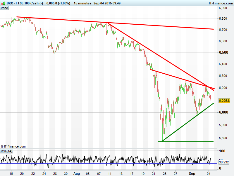 UK 100  fallen back from test of 6200, maintaining trend of falling highs since 10 Aug. A break above this and 6260 late-Aug highs still likely needed to allow rally back to 6700. Rising lows still valid from 23 Aug.