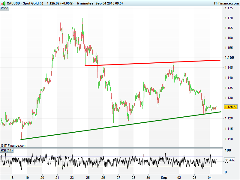 Gold crawling along a rising support line and hugging the $1125 level with mild uncertainty and investor trepidation ahead of US jobs data delaying potentially significant moves until this afternoon.