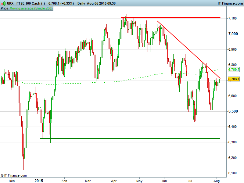 UK 100 testing falling highs since April with any potential breakout likely to encounter resistance at or near the 200-day MA 6770.