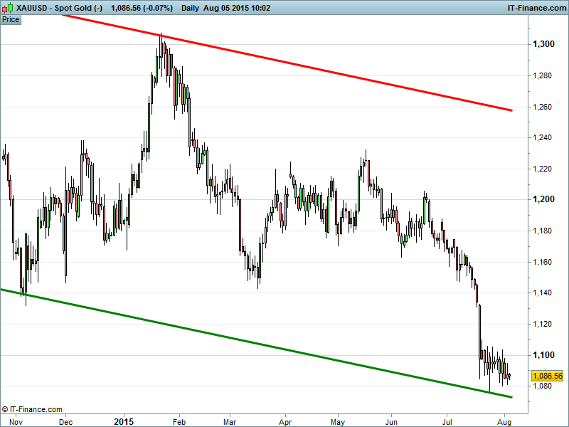 Gold’s long term woes continue with the yellow metal remaining in its slightly downwards trending range this morning. Will we see a bounce off support like that in Nov 2014?