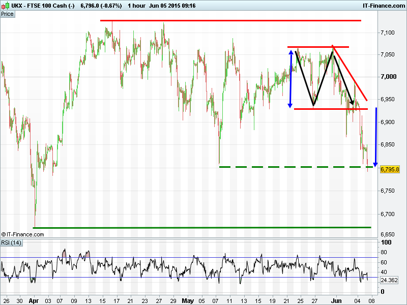 UK 100 completed bearish double-top pattern with fall back to 6810. With projections merely minimum objectives, and with the index testing 6800, potential for more downside.