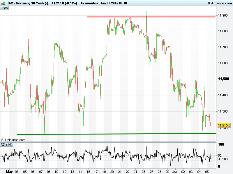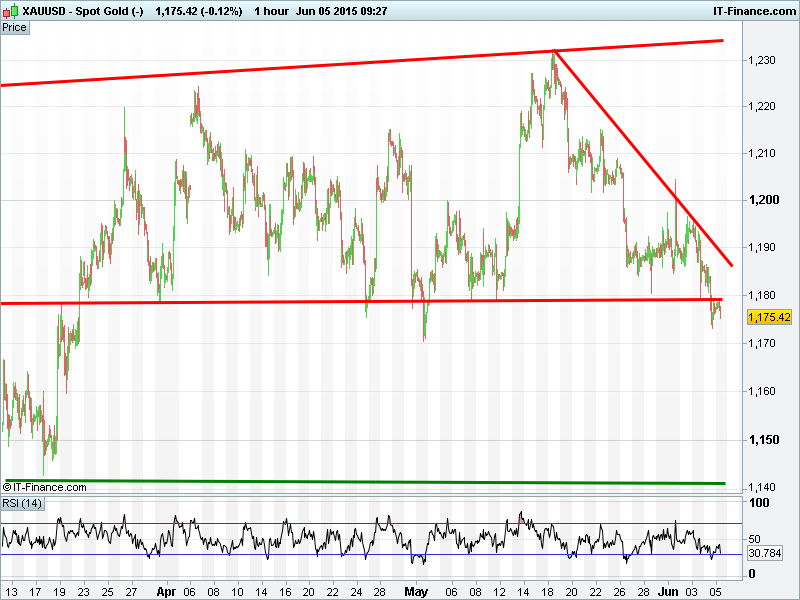 Equity markets remain in the red after Greece elected to use a loophole deferral of its IMF debt payment until month end, suggesting nothing left in the coffers and closer to default as negotiations with creditors make little progress. Caution set in ahead of US jobs report also, with a good report likely to be interpreted as stimulus- and thus market-negative in this era of addiction to cheap money and fear of a Fed rate rise. UK 100 completed bearish double-top and now testing 6800, DAX holding around 11200 May lows, Wall St futures still testing Feb rising support and Gold fallen below $1180.