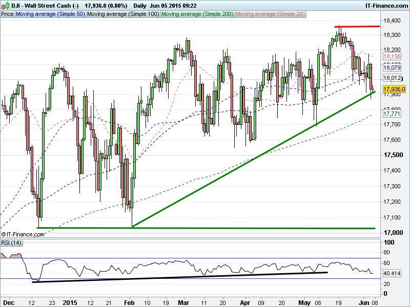 US Dow Jones still testing rising support from February via downtrend from mid-May. If 4-month uptrend broken, watch for support from 200-day MA 17770