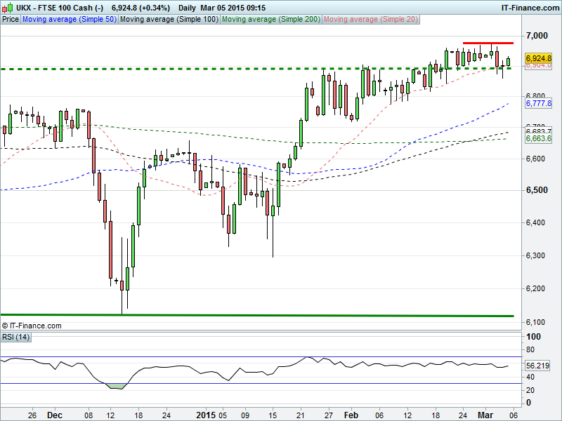 The UK Index  is looking for support around 6890 for a bounce towards all-time highs of 6980 and above; continuing to benefit from rising lows from Dec ’14 and a supportive 20-day moving average through Feb. The index has bee range bound, however, for the past 13 days.