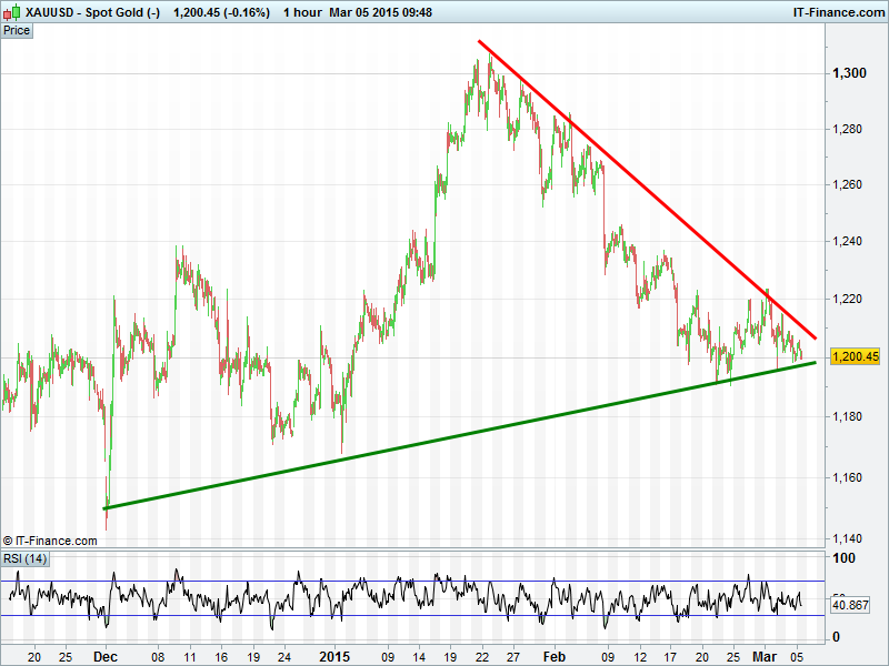 Gold’s recovery has faded further this morning and is still in a downtrend from Jan highs, although falling highs soon to intersect with rising lows to promote a decisive break the direction of which may to be confirmed at US Non-Farms tomorrow.