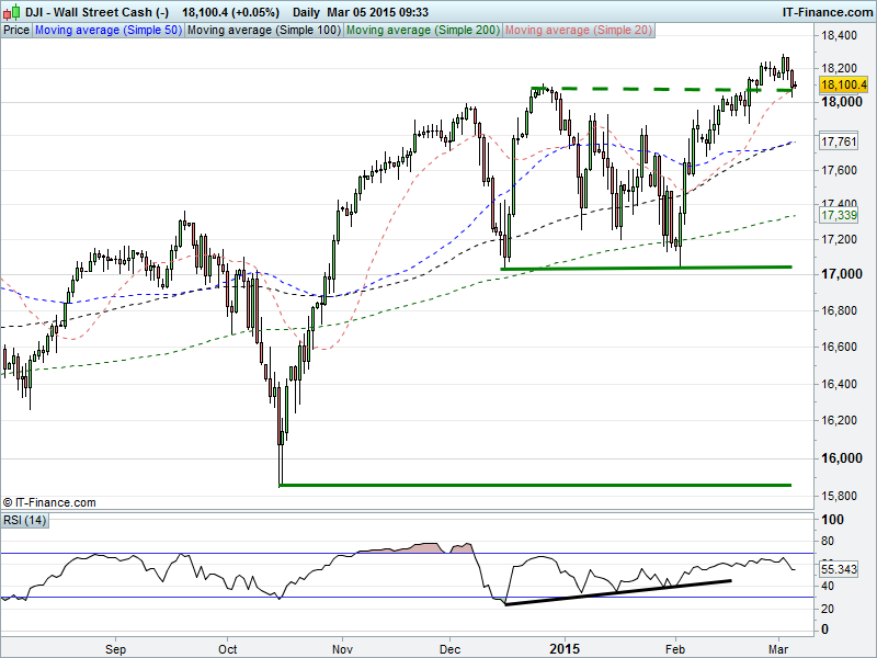 The US Dow Jones has fallen back to test support at recent lows 18080 this morning having posted two days of declines from all time highs 18284 seen on 2 March. If 18080 proves supportive and US Fed talk swings dovishly, we could see the uptrend regain momentum.