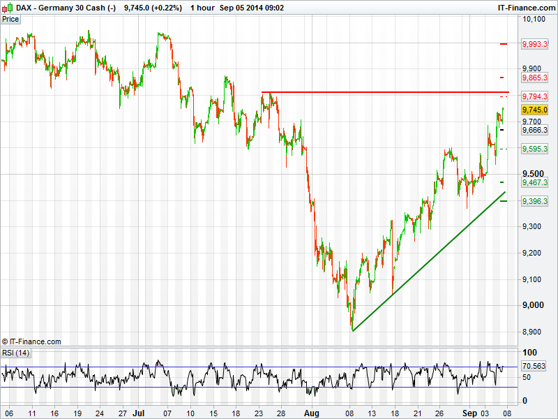 Germany’s DAX is trading back at 5 week highs today after the ECB’s rate cut decision yesterday helped to push markets higher. Resistance may come around 9812, with support at the 1 month rising trend line still intact.