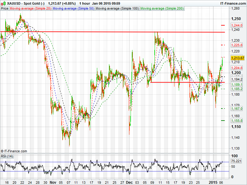 Spot Gold has managed to break above 1200 to trade at a 3 week high, although resistance was met at 1214. The 50 day moving average has broken above the 100 day moving average, both of which could act as support. Should resistance at 1214 be broken then Gold could head towards mid December level’s of 1224. The RSI is overbought.