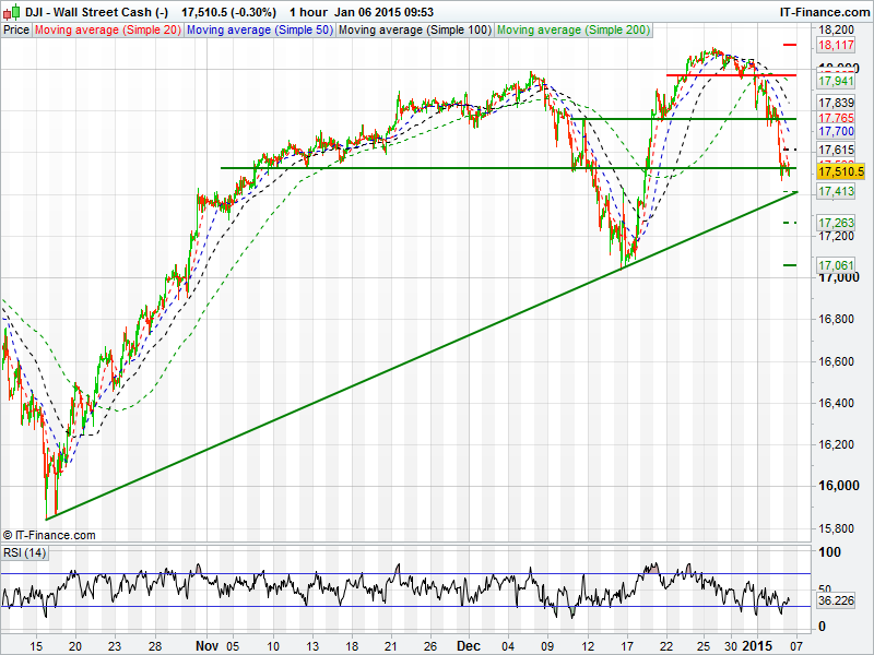 US Dow Jones sold off heavily yesterday to trade at 3 week low. The 3 month uptrend is still intact with the trend line possibly giving support. Support may firstly come around 17500 with a breach bringing the 3 month trend line into play. Resistance may come at 17600 and again at the 50 day moving average around 17700.