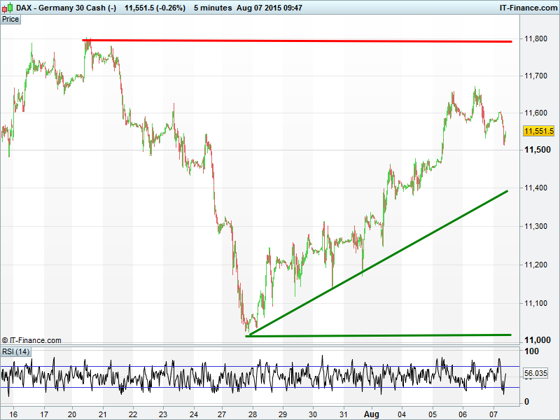 Germany’s DAX trading back from the week’s and rebound highs having found resistance at trendline of falling highs dating back to late April. But yet to test 11500, a test of which could lead to further retracement.