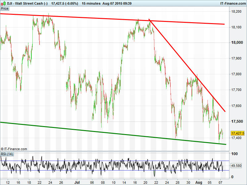 US Dow Jones still wrestling with downtrend from mid-July, helped only by shallow falling support at 17370. Beware potential 200-day MA resistance at 17844 which is just above end-July highs. Watch for NFP at 1.30pm which could see the index swing around.
